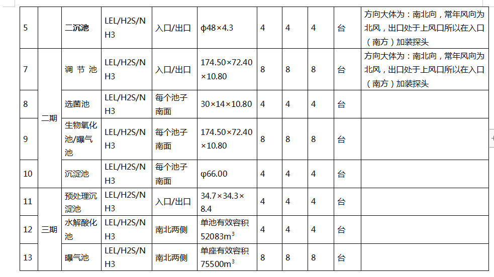 1.1.2 根據(jù)污水處理廠的常用監(jiān)控氣體種類為:可燃氣、H2S和NH3,建議設置VOC檢測器,以檢測有機揮發(fā)物。因此在每個監(jiān)控點上均布置相同的可燃氣、H2S和NH3 探頭。