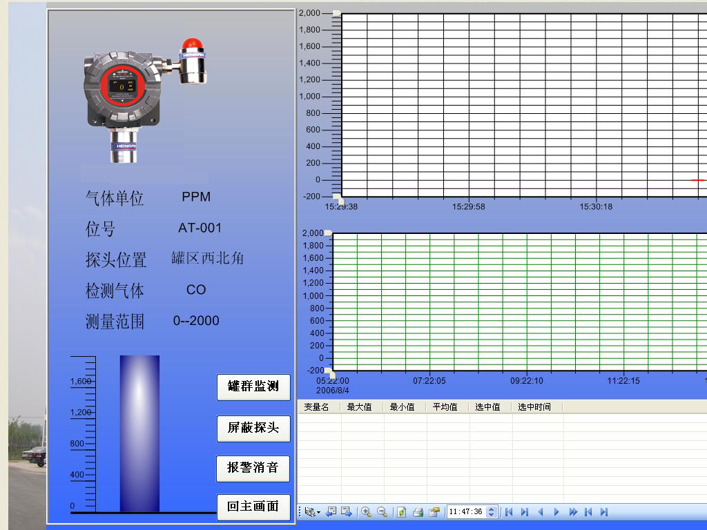 操作人員可以通過工控機的觸摸屏、操作員站和工程師站等人機交互界面,實時監(jiān)視廠區(qū)內(nèi)所有檢測點的情況,主要有氣體濃度值,報警上限,實時曲線和歷史數(shù)據(jù)等。當(dāng)發(fā)生報警時也可以通過工控機進行消音和報警響應(yīng)。