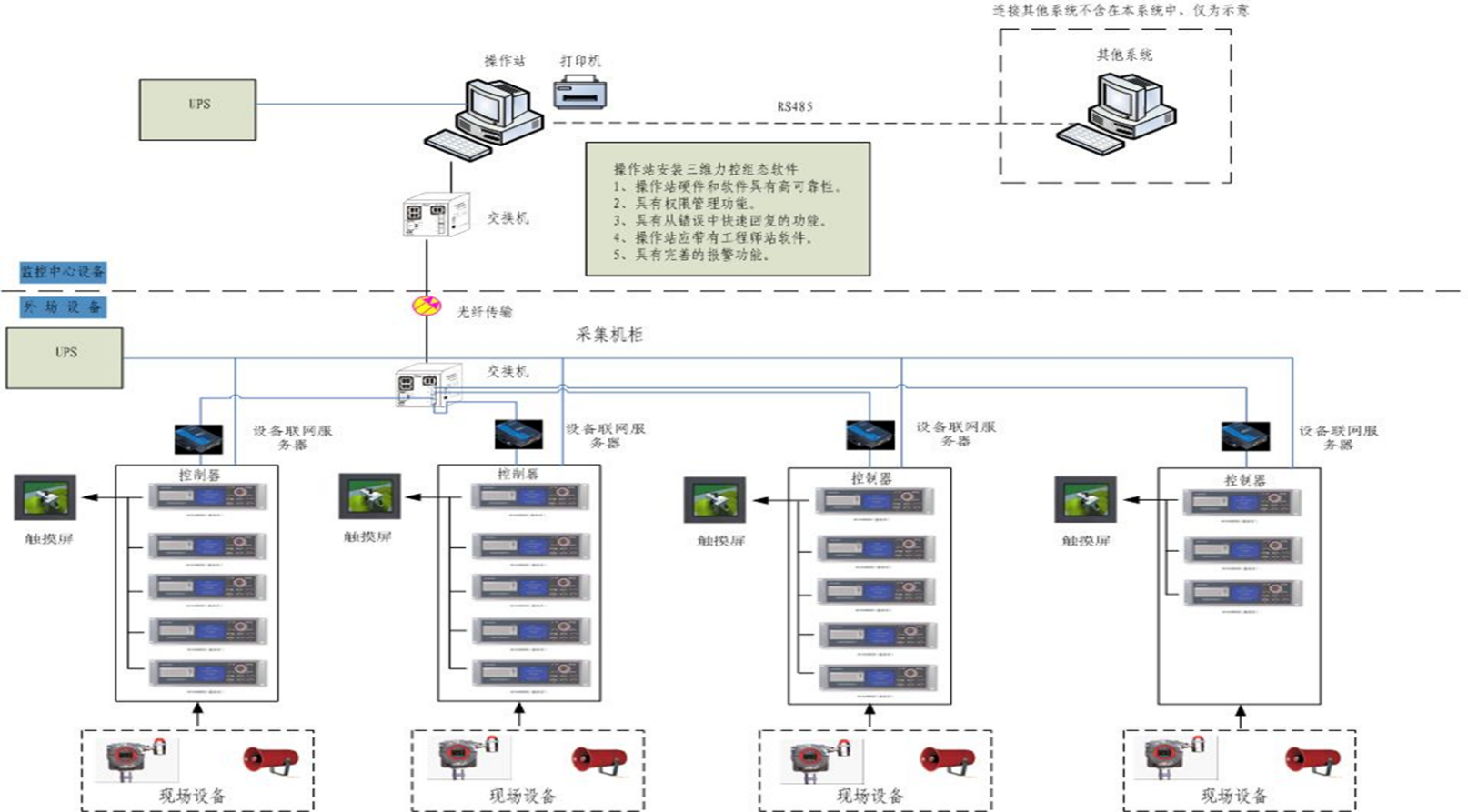 系統(tǒng)由安裝在現(xiàn)場的可燃/有毒氣體探測器和安裝在控制室內(nèi)的控制單元、數(shù)據(jù)采集模塊、工作站等組成。通過數(shù)據(jù)采集模塊對現(xiàn)場檢測器實施數(shù)據(jù)采集,并通過通訊模件完成于操作員站或第三方系統(tǒng)(設(shè)備)之間的通訊,接受相關(guān)信息并傳遞實時數(shù)據(jù)。