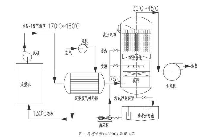 系統(tǒng)包括:定型廢氣換熱系統(tǒng)、濕式靜電裝置系統(tǒng)、主風(fēng)機等,主要設(shè)備參數(shù)見表1。