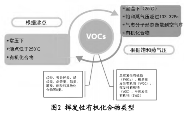 分析發(fā)現(xiàn)VOCs的危害主要表現(xiàn)在大氣環(huán)境(組成成分與類型見圖1、2),具體表現(xiàn)為兩點(diǎn):首先VOCs具有光化學(xué)特點(diǎn),受到太陽(yáng)光、熱條件作用,N0x、VOCs會(huì)形成不同的光化學(xué)氧化劑。因?yàn)槌粞跽急瘸^(guò)90%,所以臭氧便成為光化學(xué)氧化劑中最為典型的物質(zhì)。臭氧的存在將氧化大氣內(nèi)部SO2,NOx、VOCs氧化,氧化后形成的物質(zhì)會(huì)為二次PM2.5提供必須的陰離子,和大氣內(nèi)部的陽(yáng)離子結(jié)合之后,可以組成無(wú)機(jī)二次PM2.5,與有機(jī)氣溶膠融合,會(huì)形成二次PM2.5;其次,VOCs與光化學(xué)產(chǎn)物屬于毒害物質(zhì),與人體接觸會(huì)危害身體健康。