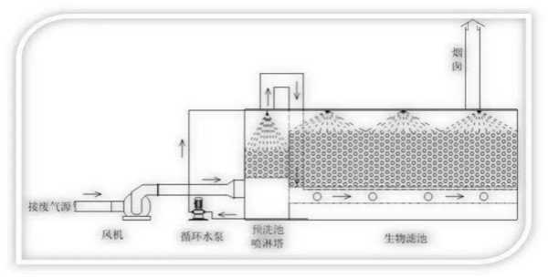 工藝流程:臭氣收集→風(fēng)管輸送→抽風(fēng)機(jī)→預(yù)洗池加濕→生物濾池吸收→生物氧化→無(wú)害氣體排放